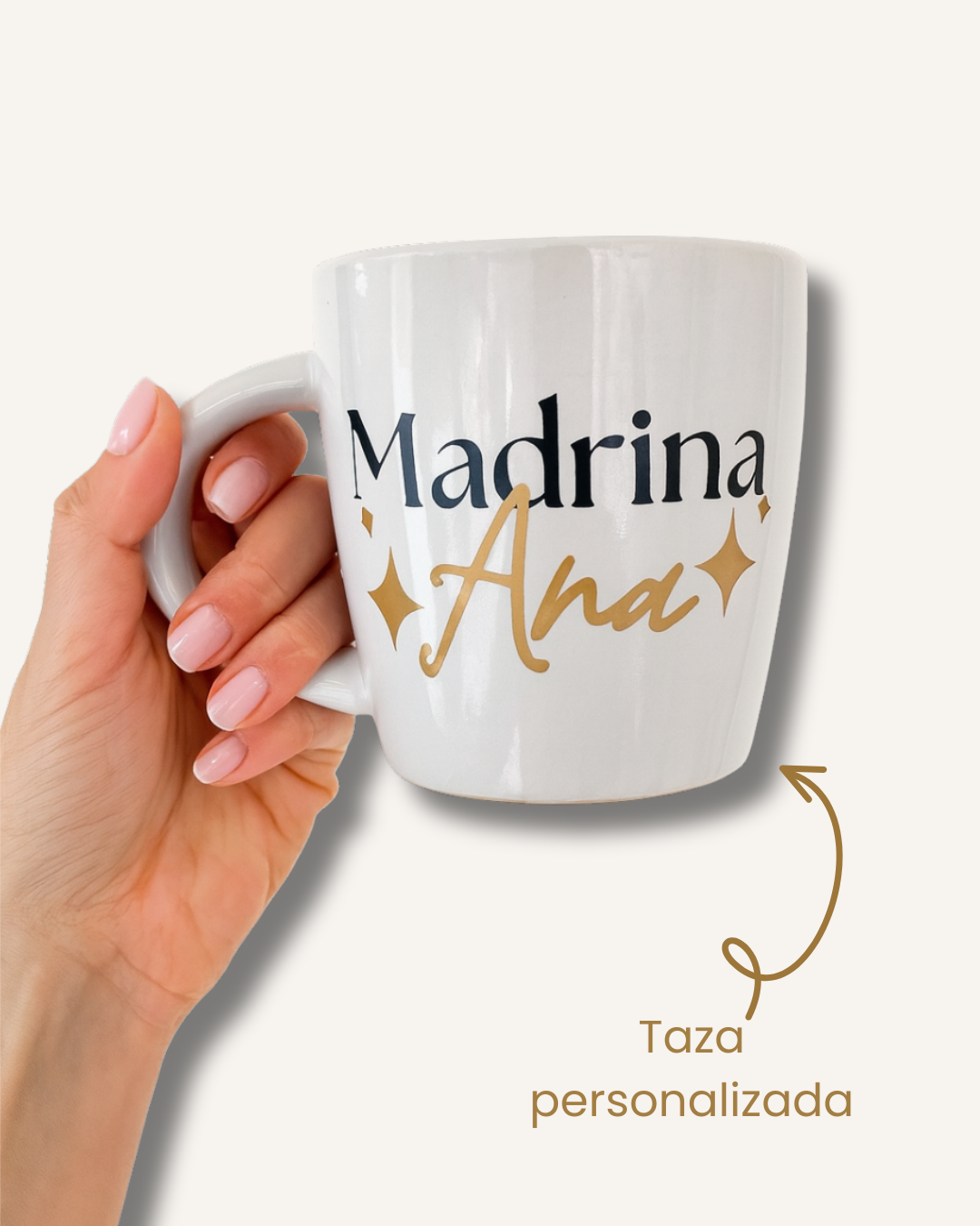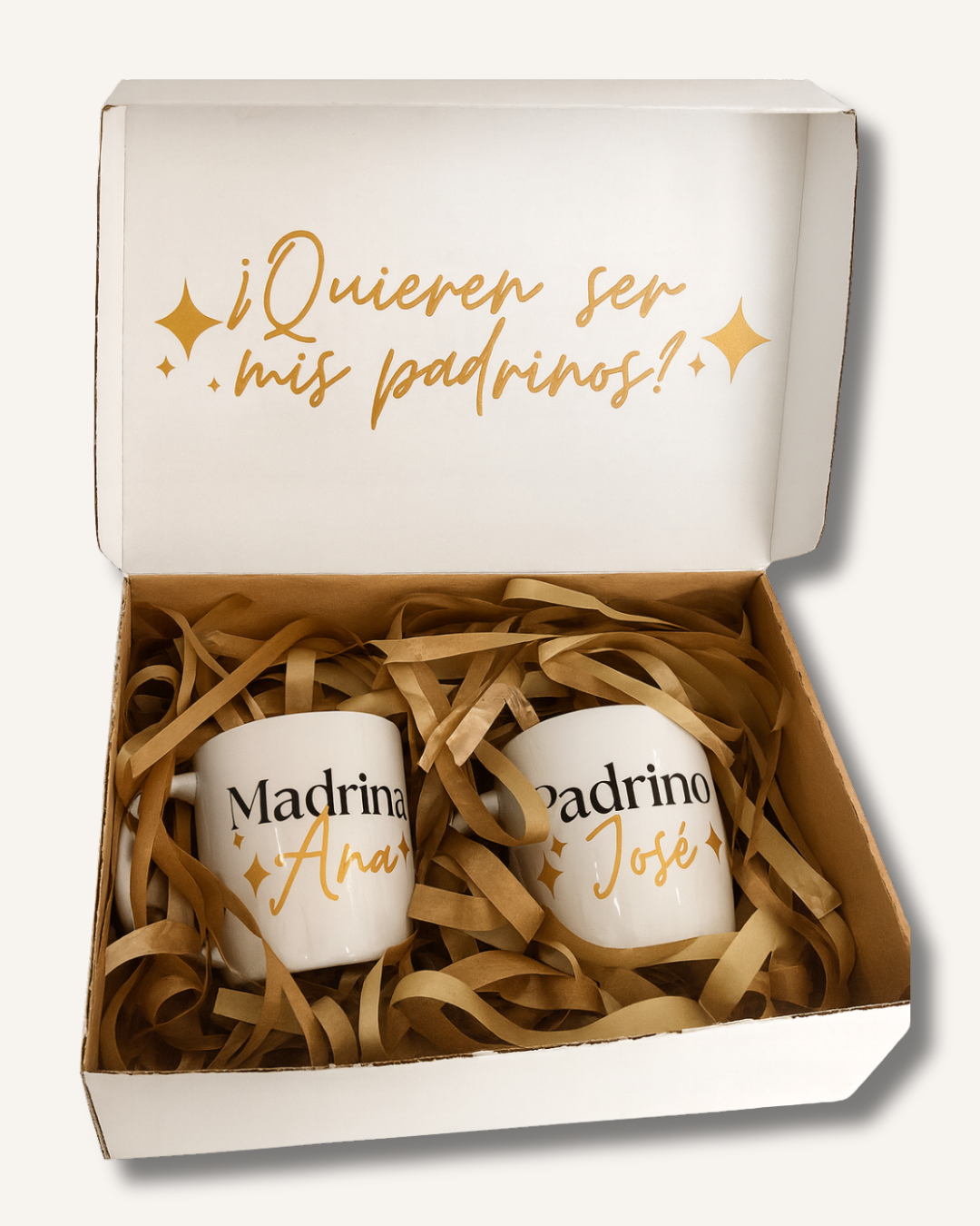 Esta hermosa caja personalizada es la forma perfecta de sorprender a quienes serán parte de un día tan importante. Incluye dos tazas con nombres personalizados de los padrinos, con la frase dorada “¿Quieren ser mis padrinos?” en la tapa.