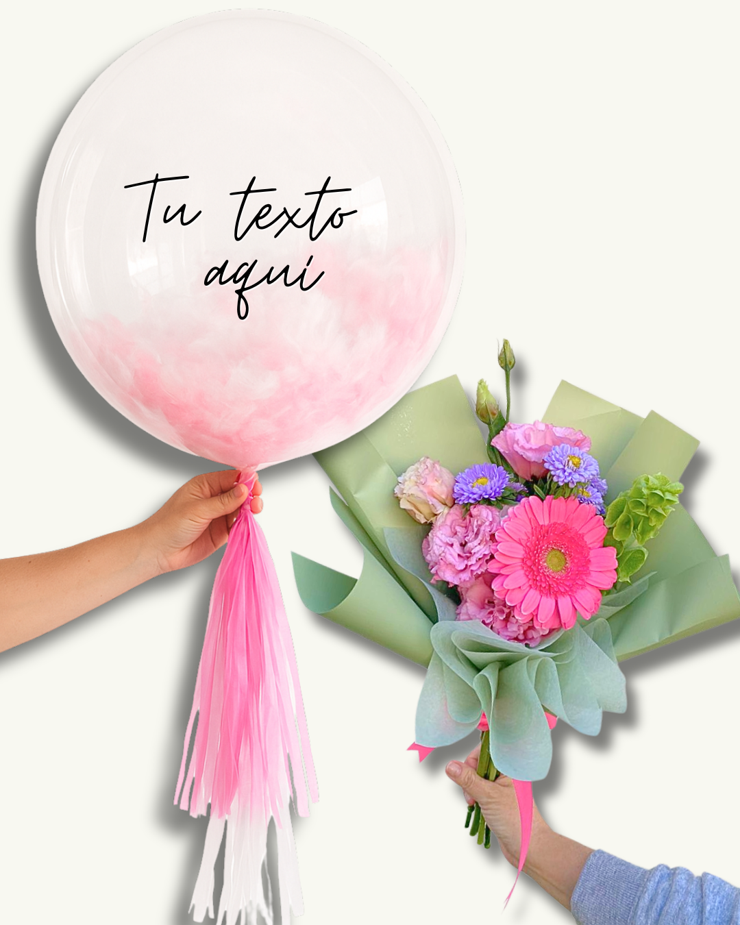 Un detalle lleno de frescura y ternura para sorprender en cualquier ocasión. Este arreglo incluye un globo burbuja que puedes personalizar con el mensaje que desees, acompañado de un ramo chico de flores en tonos rosas y morados envueltas en papel elegante con lazo a juego.