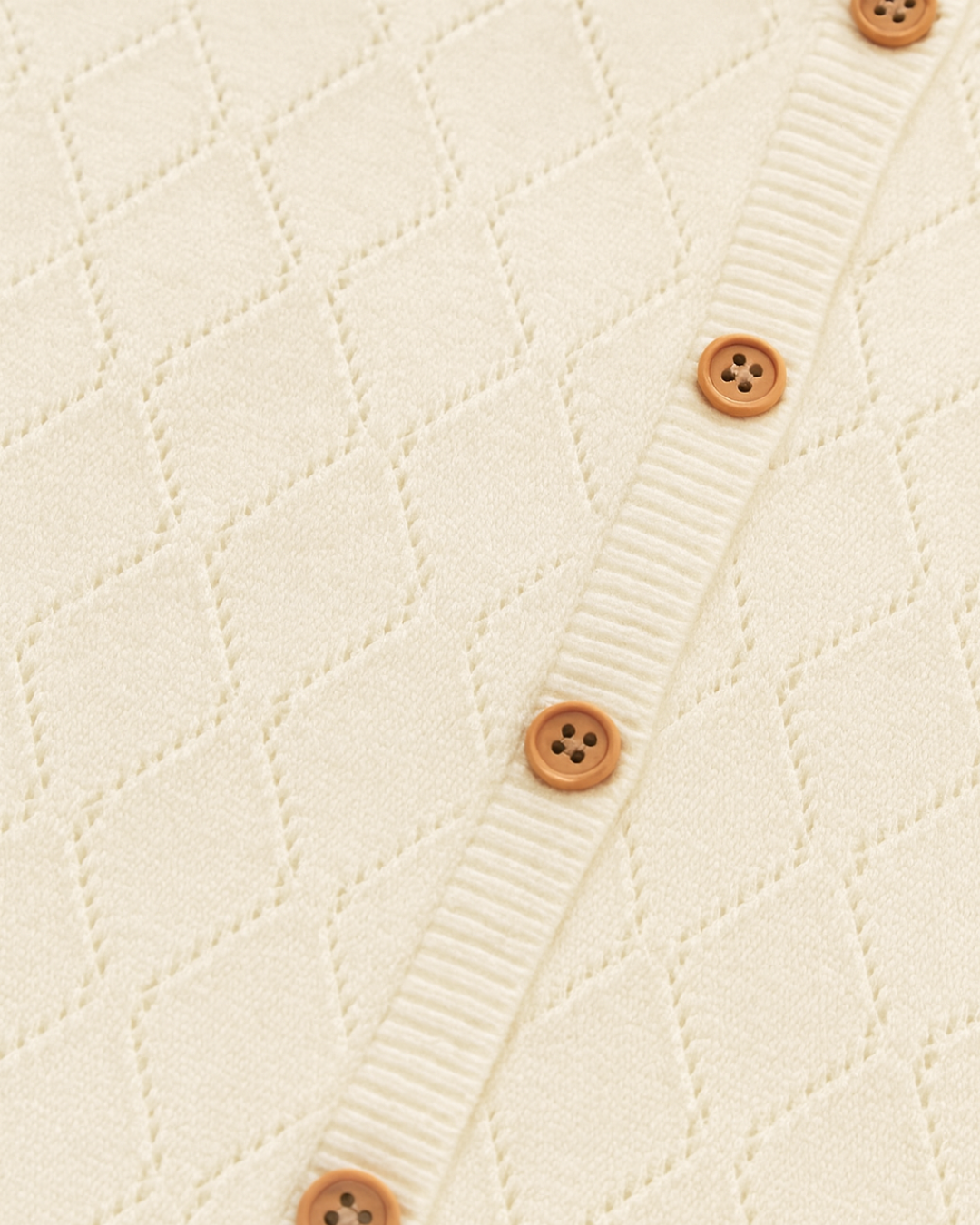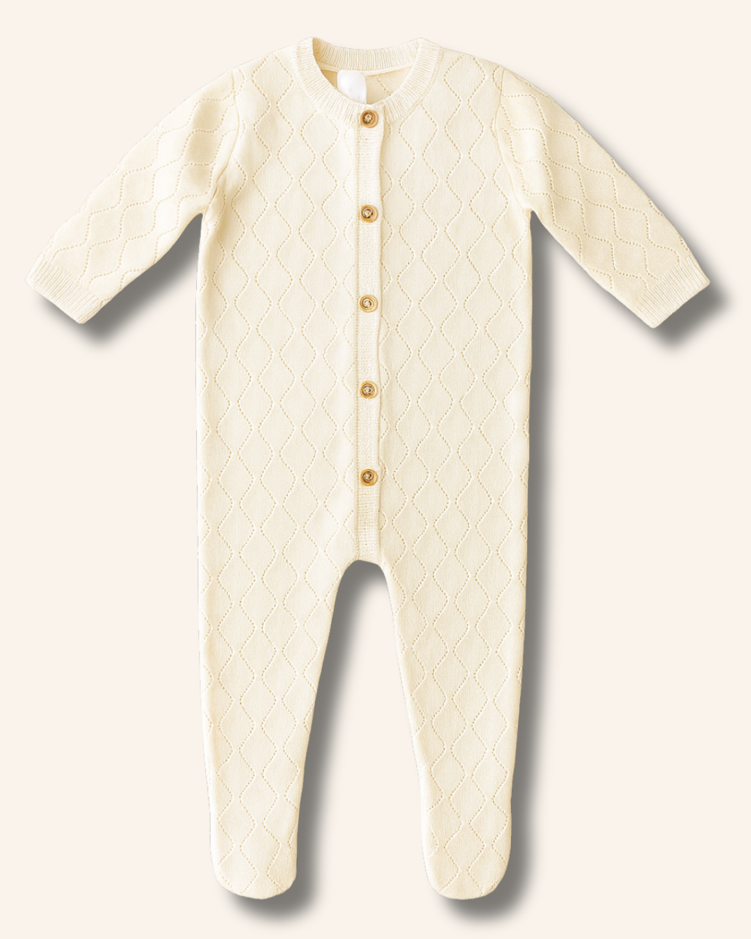 Un regalo lleno de ternura y estilo. Este delicado mameluco tejido en color crema es la prenda ideal para envolver a los más pequeños en suavidad y confort. Su diseño clásico con patrón de rombos y botones frontales lo convierte en una pieza elegante, perfecta para ocasiones especiales o para consentir en el día a día.