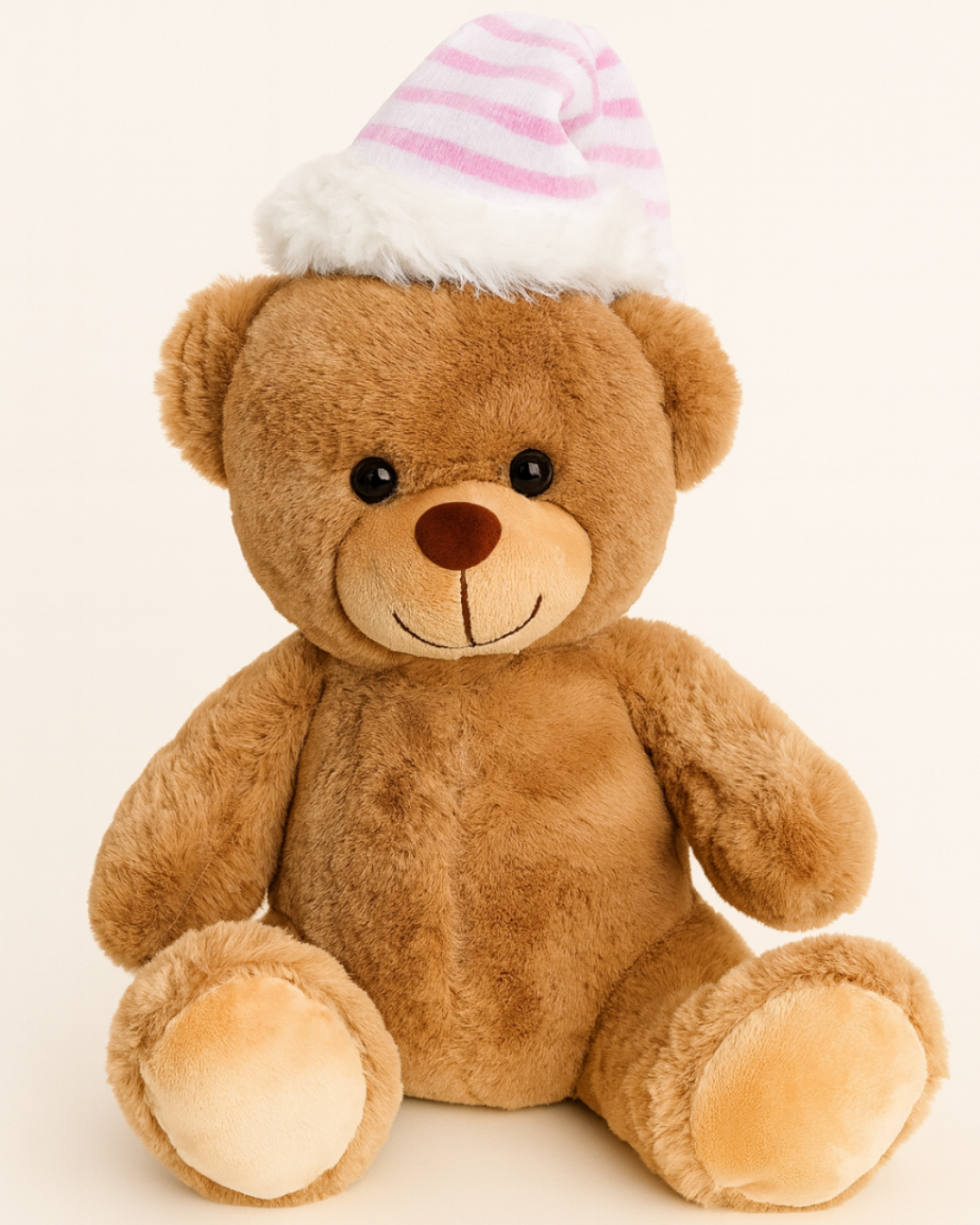 El Osito Bongy dulce es pura ternura con estilo con su gorro navideño rosa con blanco representa esa mezcla ideal entre cariño y calidez desde el primer momento.