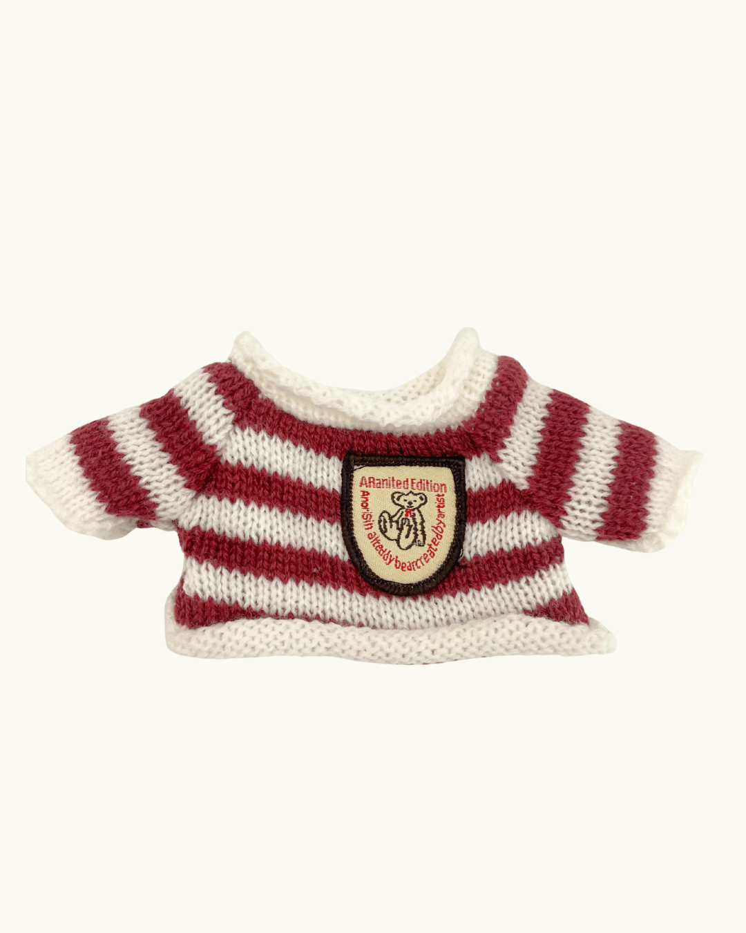 Viste a tu osito con el Suéter Rayas Rojo, una prenda para dar un toque de estilo y personalidad a tu osito Bongy.