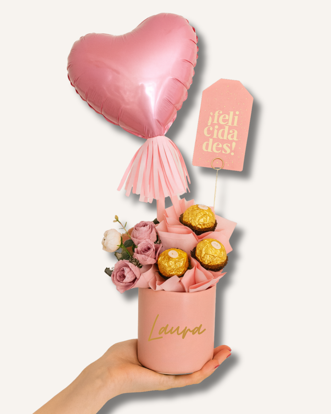 Un detalle lleno de dulzura y estilo. Nuestra Taza la mejor mamá incluye un encantador globo metálico en forma de corazón, tres chocolates Ferrero Rocher, flores decorativas en tonos pastel y una taza con el nombre personalizado en letras doradas.